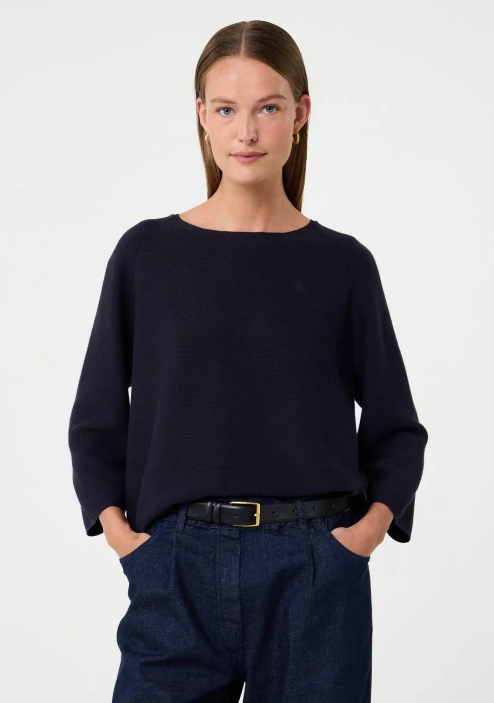 – Het model is 1.76m lang en draagt maat S