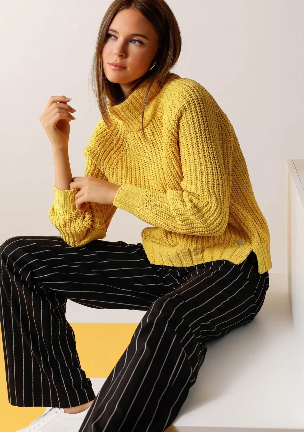 – Het model is 1.80m lang en draagt maat 38