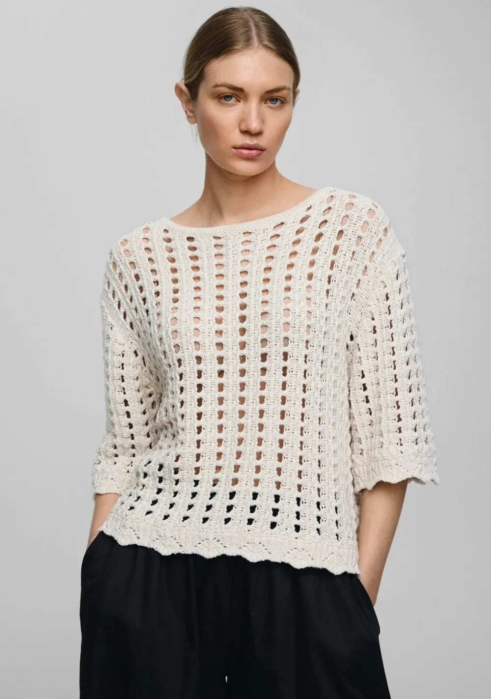 – Het model is 1.79m lang en draagt maat XS/S