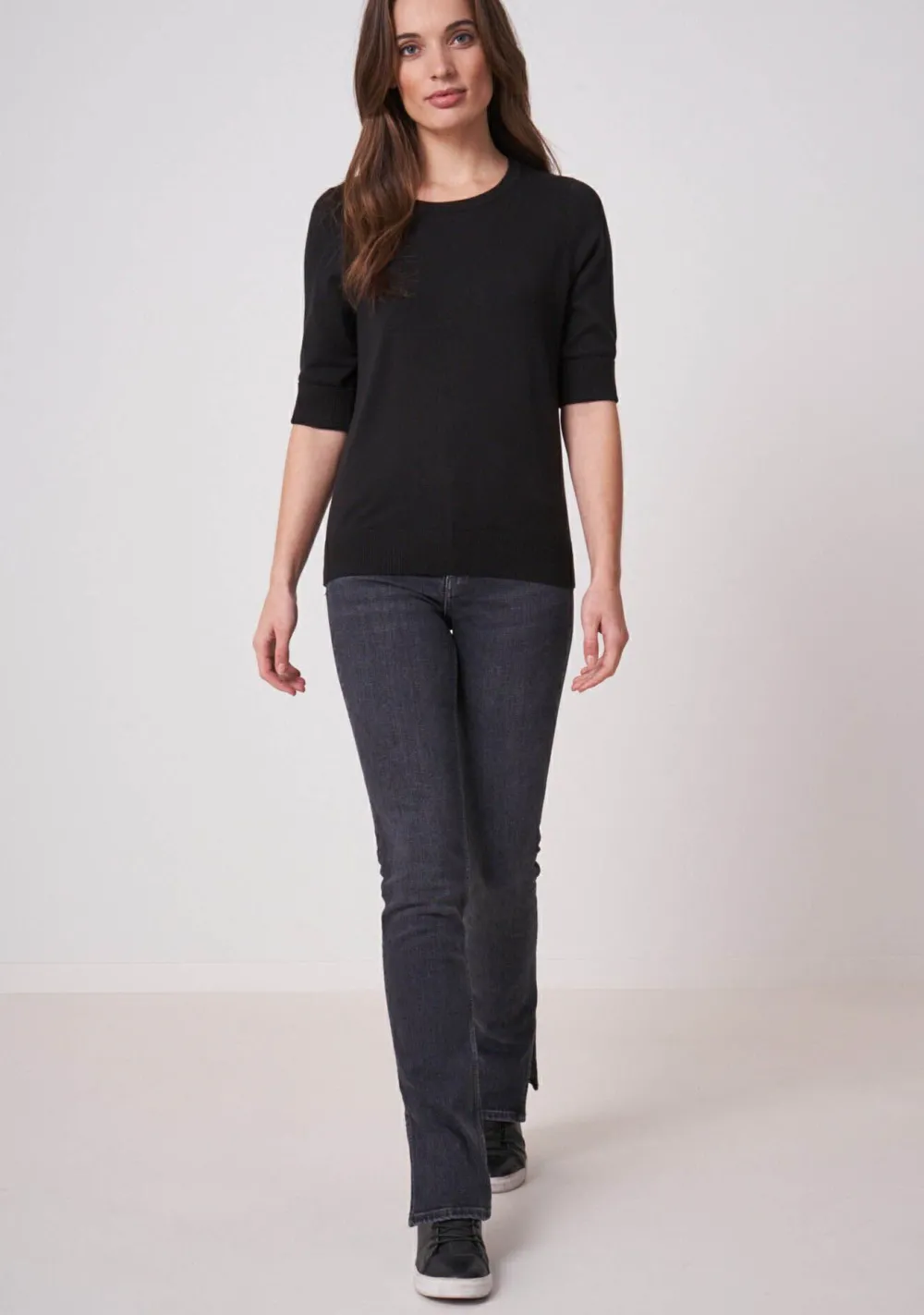 – Het model is 1.76m lang en draagt maat 38