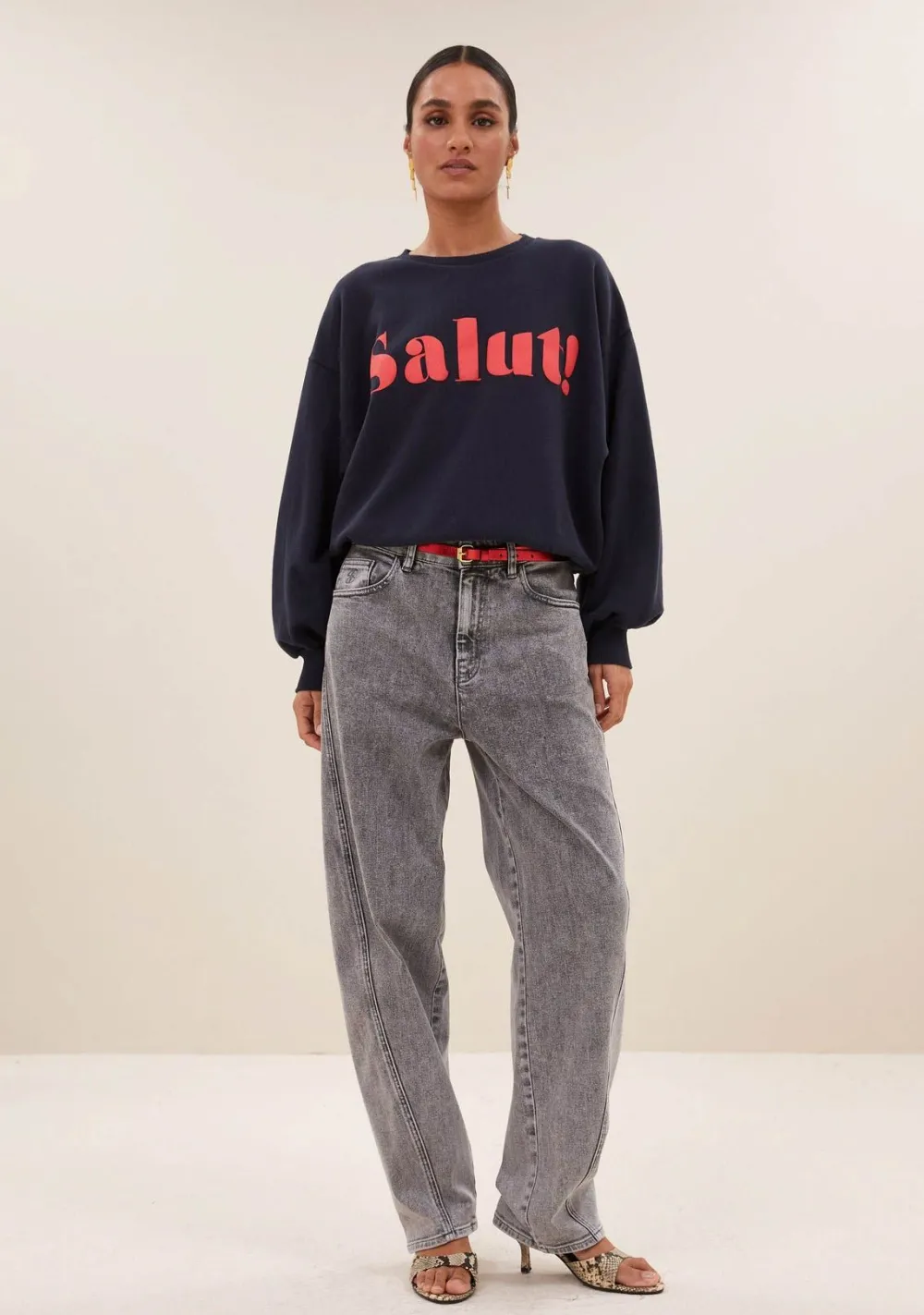 – Het model is 1.75m lang en draagt maat S