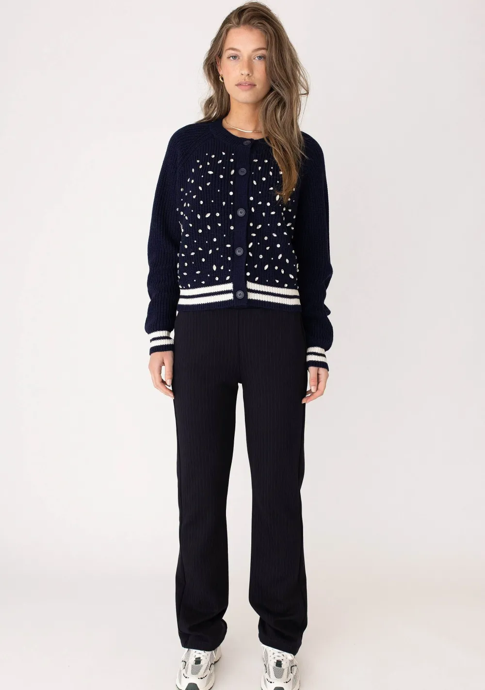 – Het model is 1.76m lang en draagt maat S