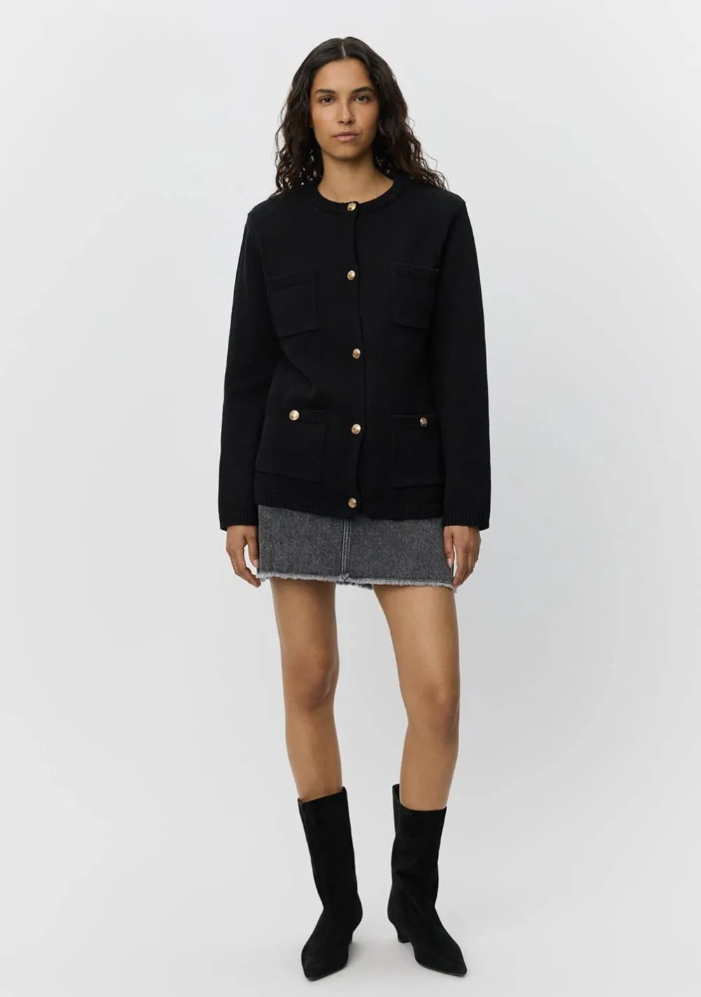 – Het model is 1.76m lang en draagt maat S